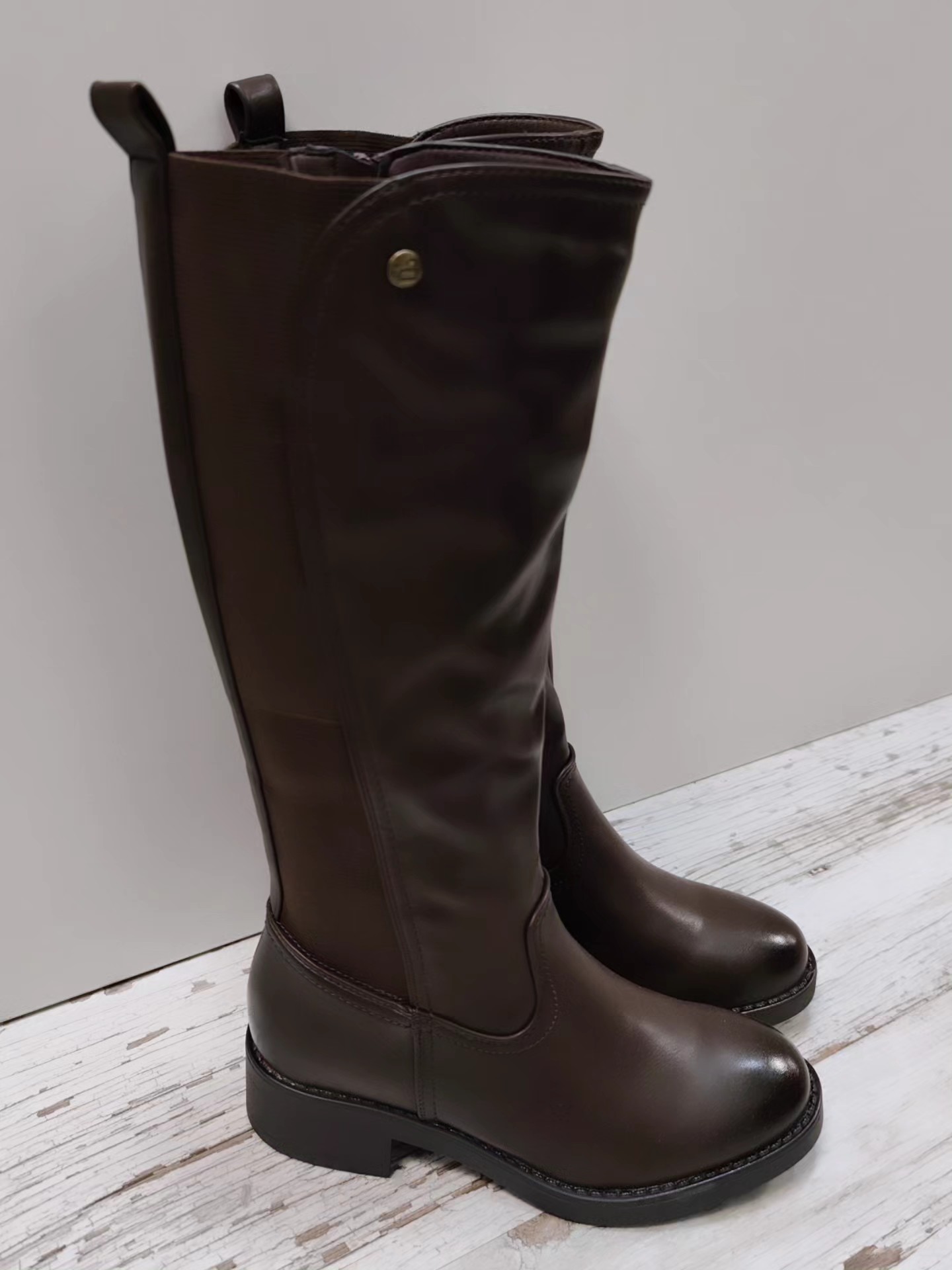 Bota alta mujer con tacón bajo , con cremallera y elástico en la parte trasera.