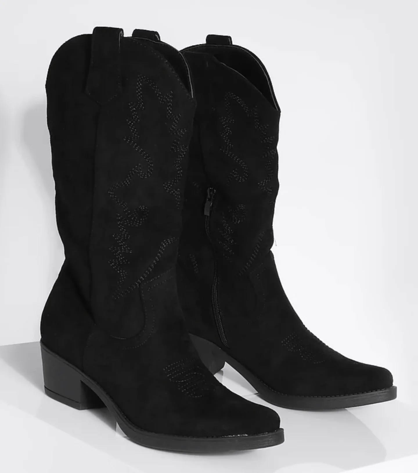 Bota alta mujer antelina con tacón , bota campera, con cremallera, en color negro.