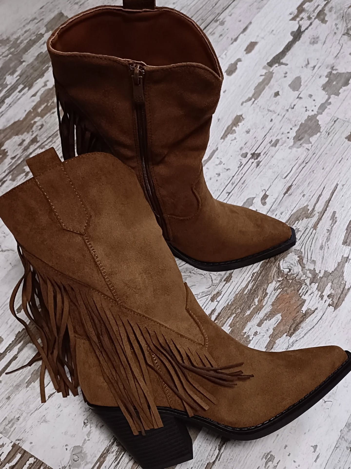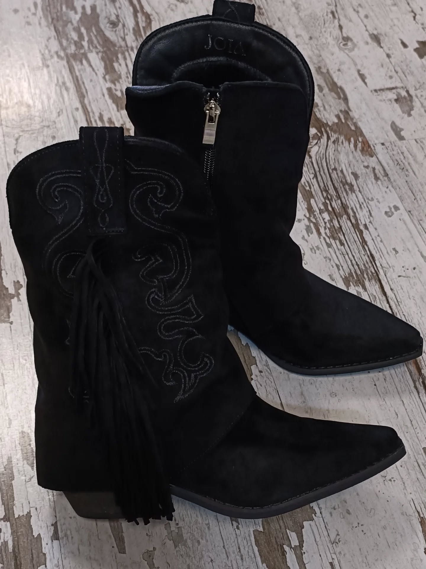 Bota alta mujer antelina con tacón , con cremallera, en color negro con flecos.