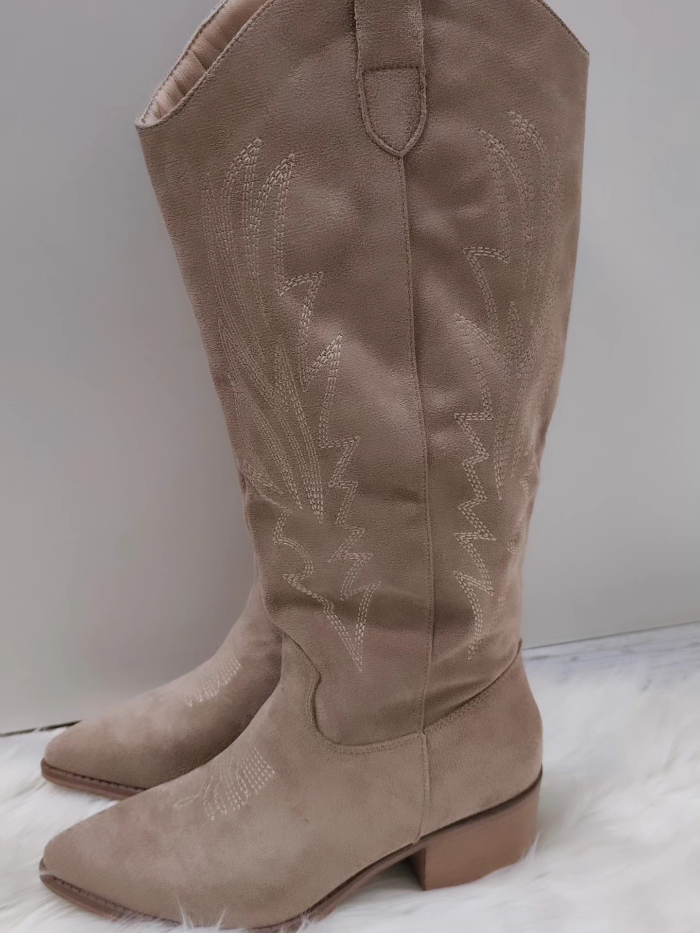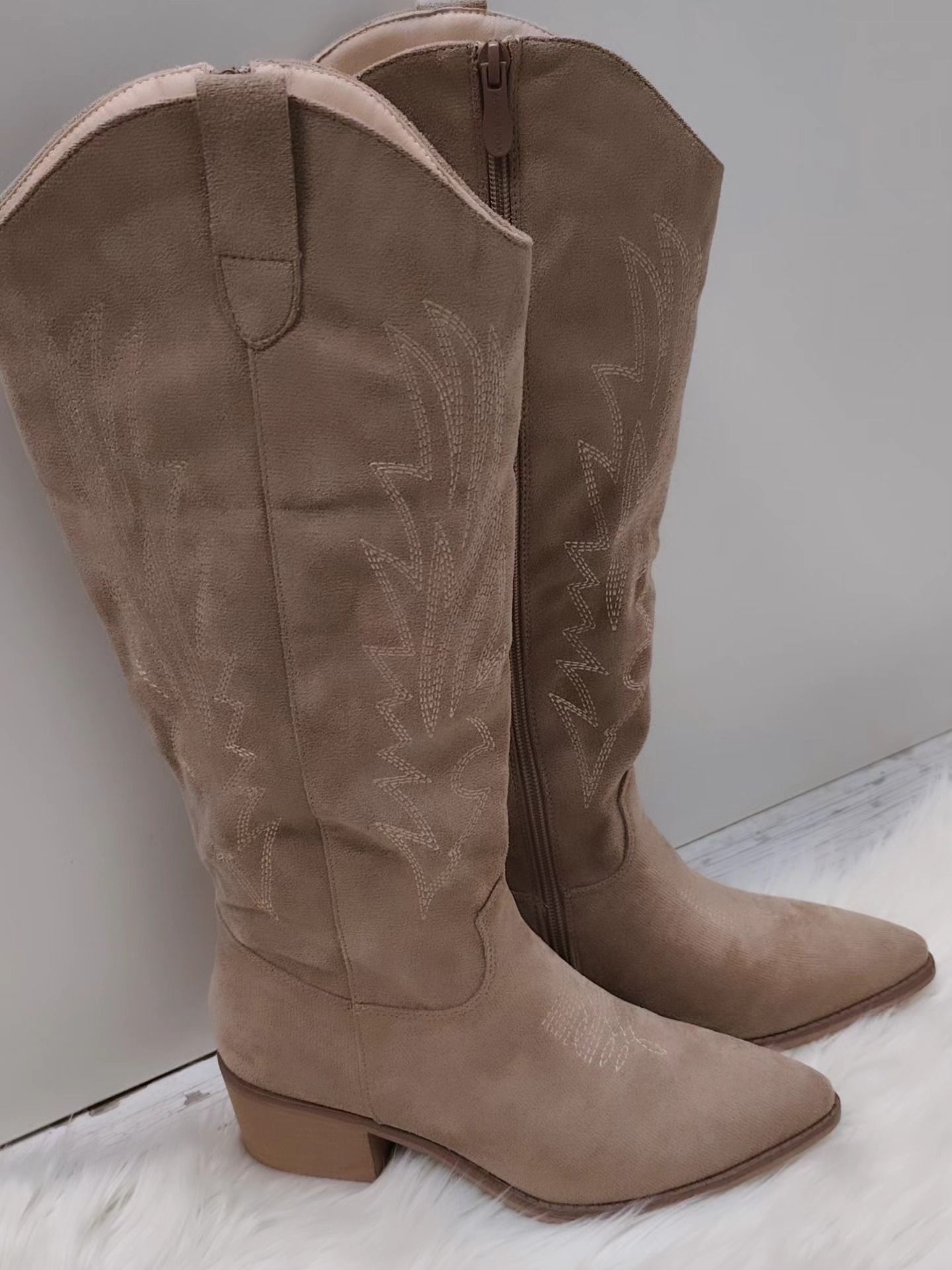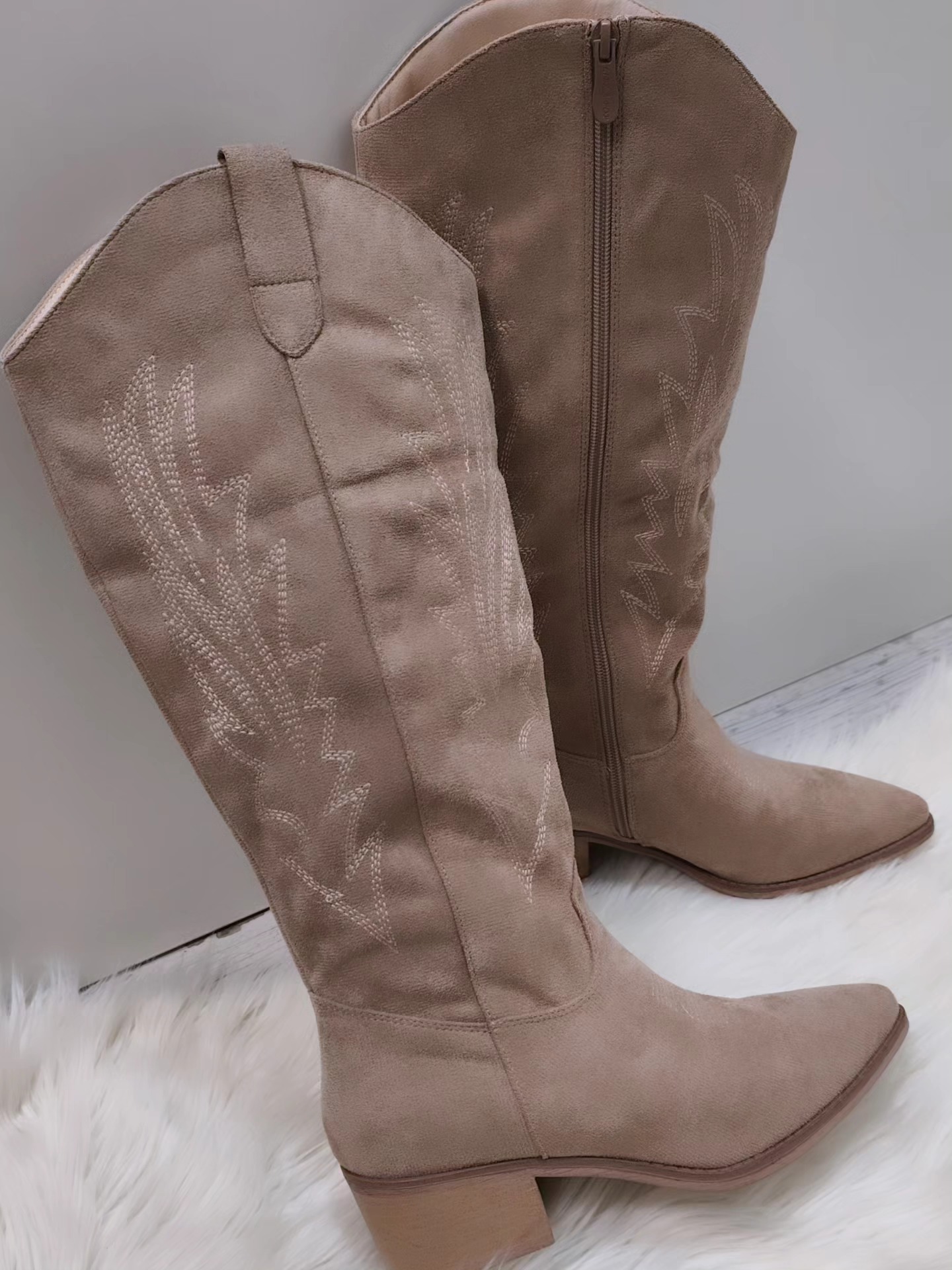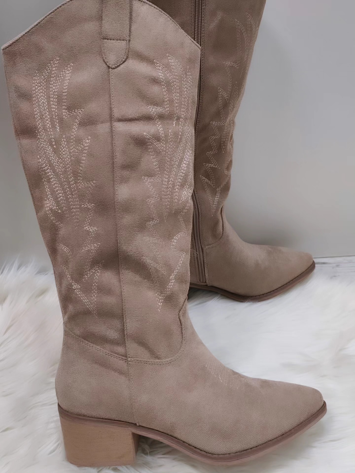 Bota alta mujer antelina con tacón bajo , con cremallera, en color kaki con grabado.